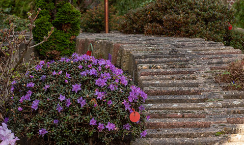 Theo's tuin is een groot feest van bijzondere rhodo's die hij is de afgelopen decennia gekweekt heeft uit zaad en door planten te kruisen. In zijn voortuin natuurlijk ook nog de rotstuin uit tuintegels opgebouwd waar de wat kleinere planten het uitstekend doen.